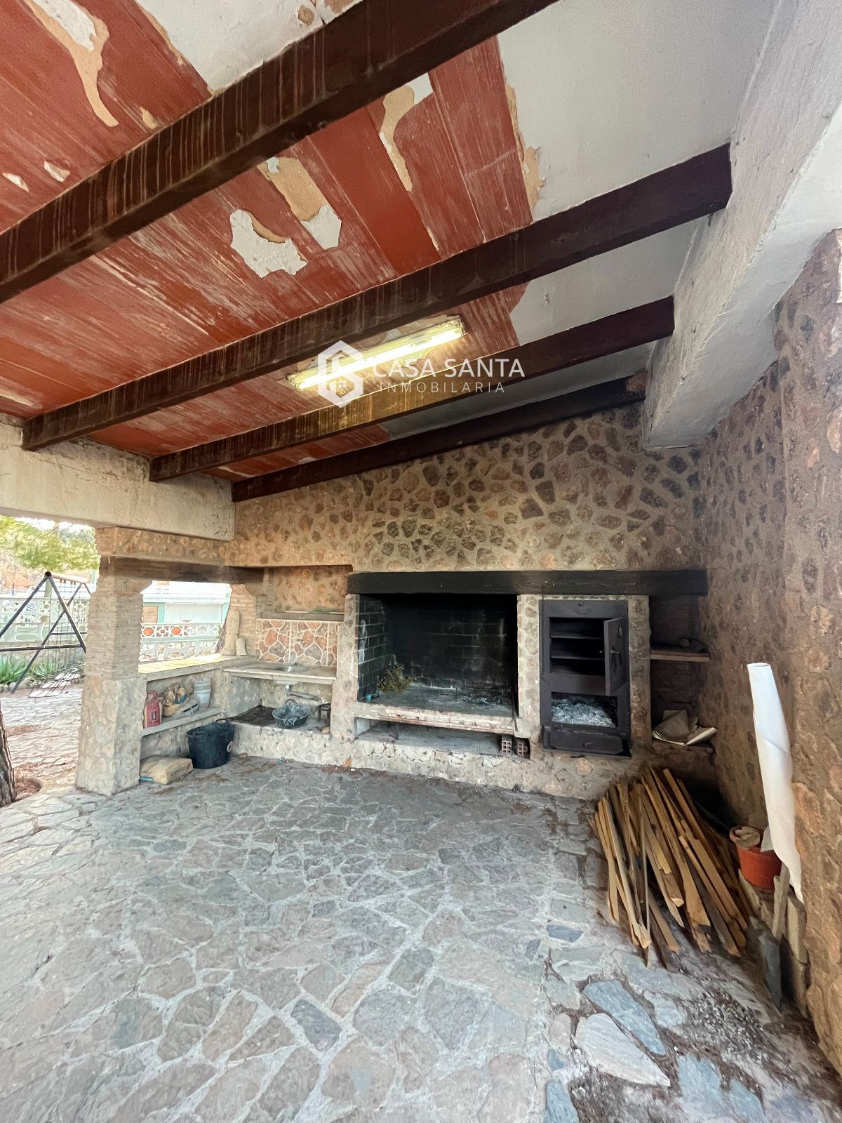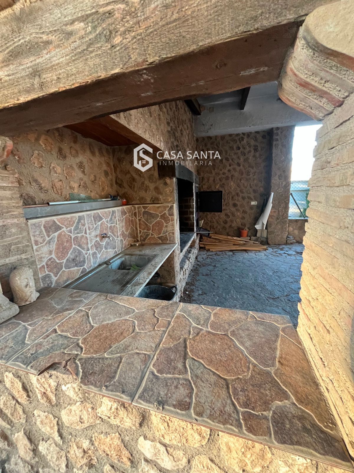 Nada más entrar, la amplitud del exterior y el espacio de aparcamiento cubierto y descubierto permiten recibir invitados con total comodidad. Desde la zona de barbacoa exterior y el área social se percibe el carácter rústico de la finca gracias a los materiales naturales y su construcción sólida.